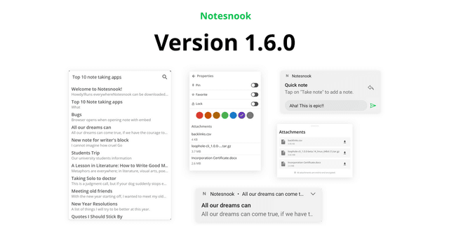 Encrypted attachments are fun. You can add any file from your device and be sure that no one can see it except you. With this release we are happy to announce that you can now attach any file, image, video or document in Notesnook.