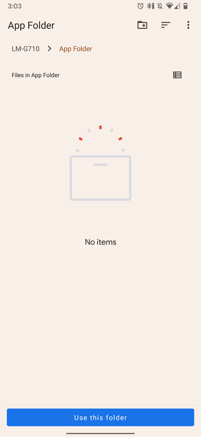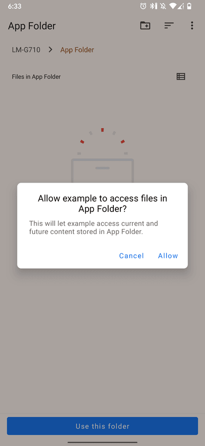let dir = await ScopedStorage.openDocumentTree(true);This does all the heavy lifting for you. Running the app, you'll see something similar to this: